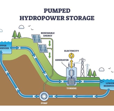 El Almacenamiento Hidroeléctrico por Bombeo (PHS) Es un sistema que utiliza el exceso de electricidad para bombear agua a un embalse superior y liberarla para generar energía cuando se necesita. Esta solución ofrece una capacidad masiva y una larga vida útil.